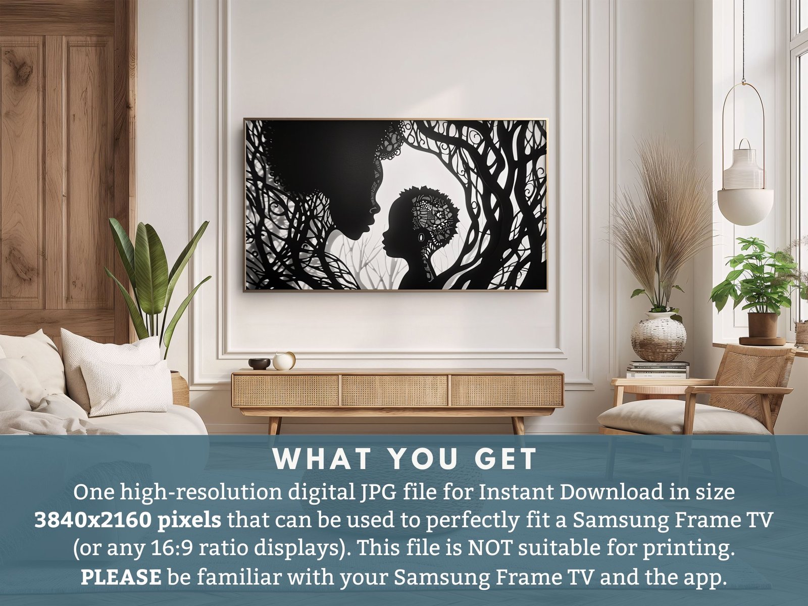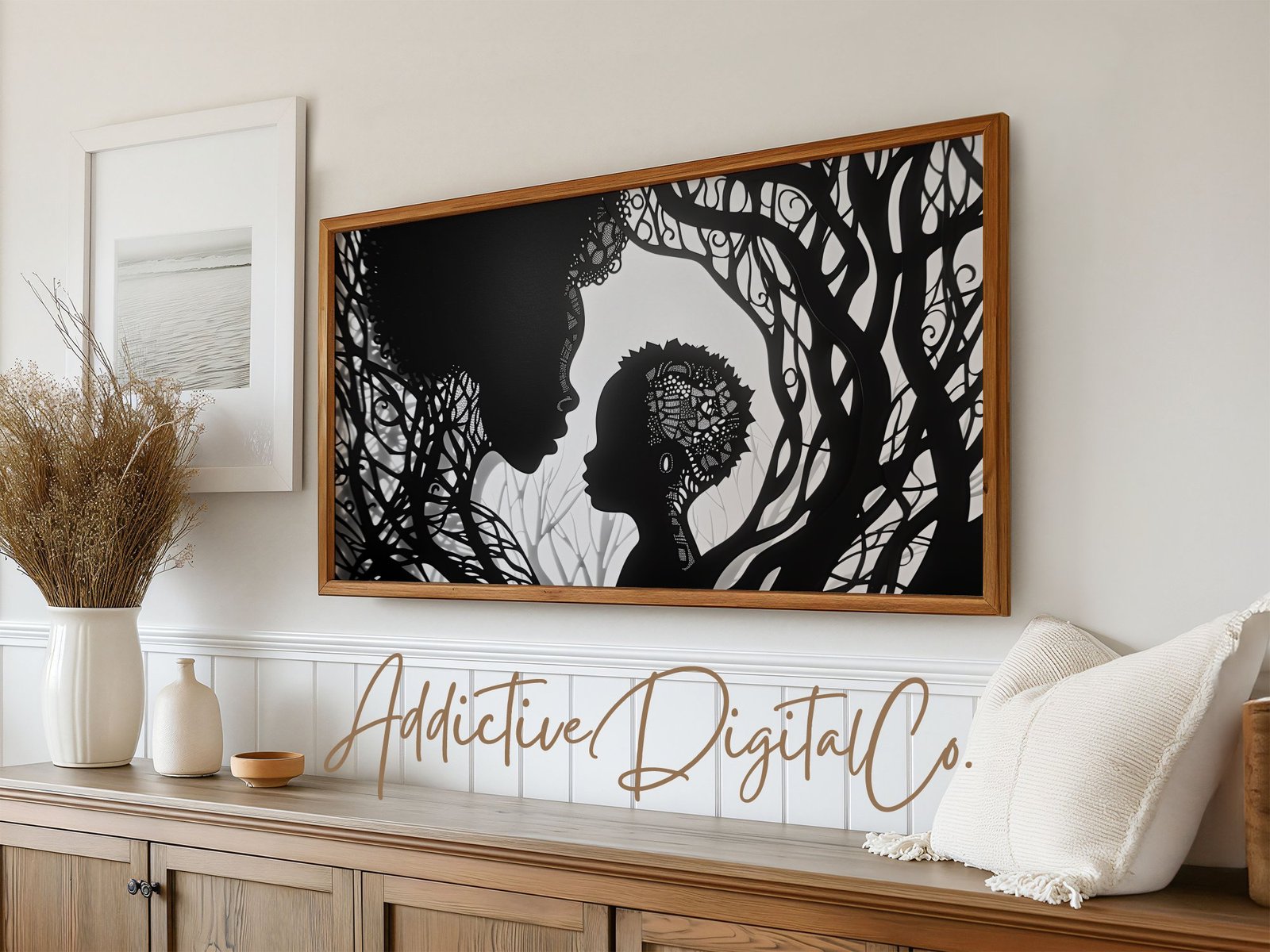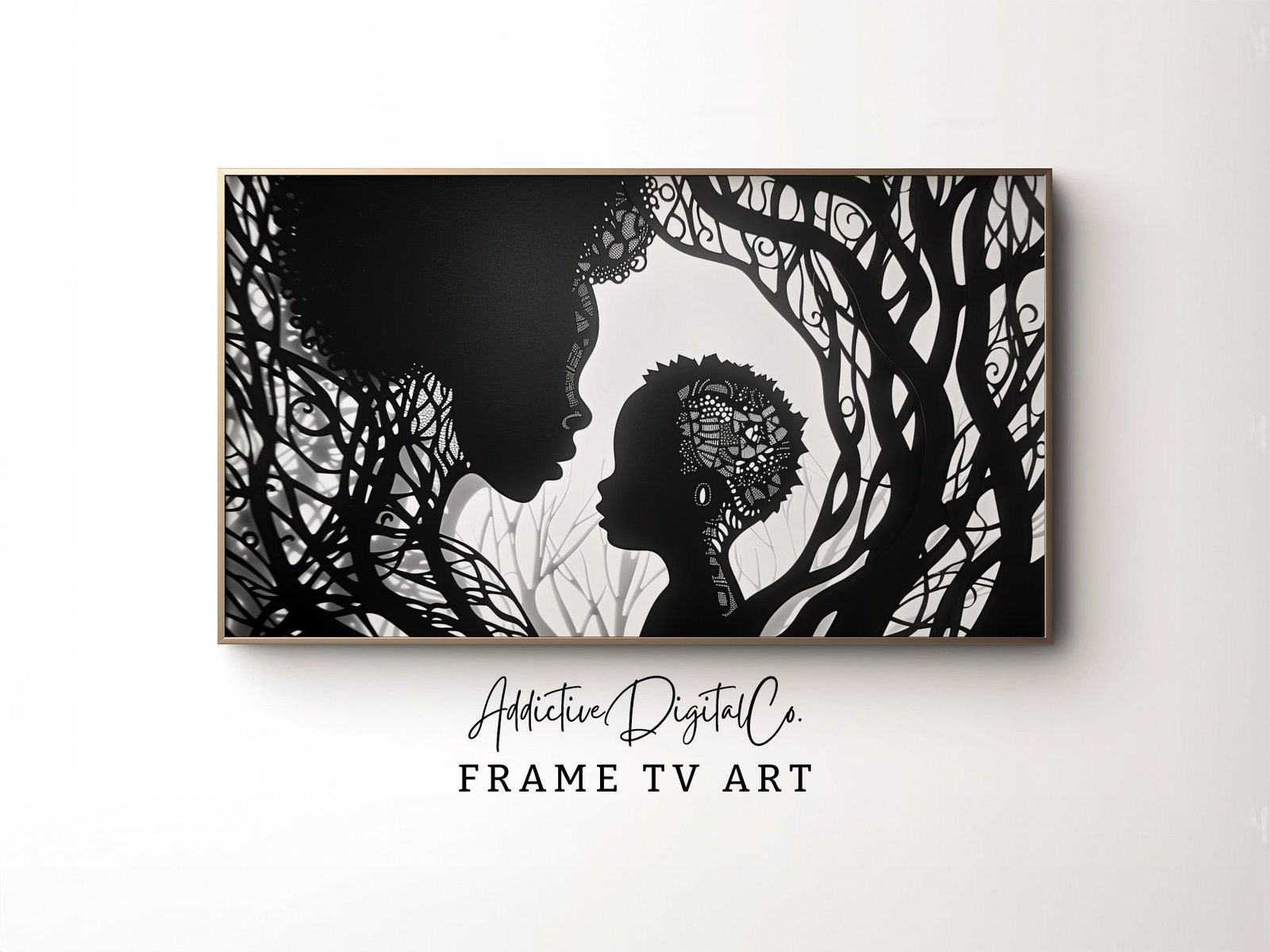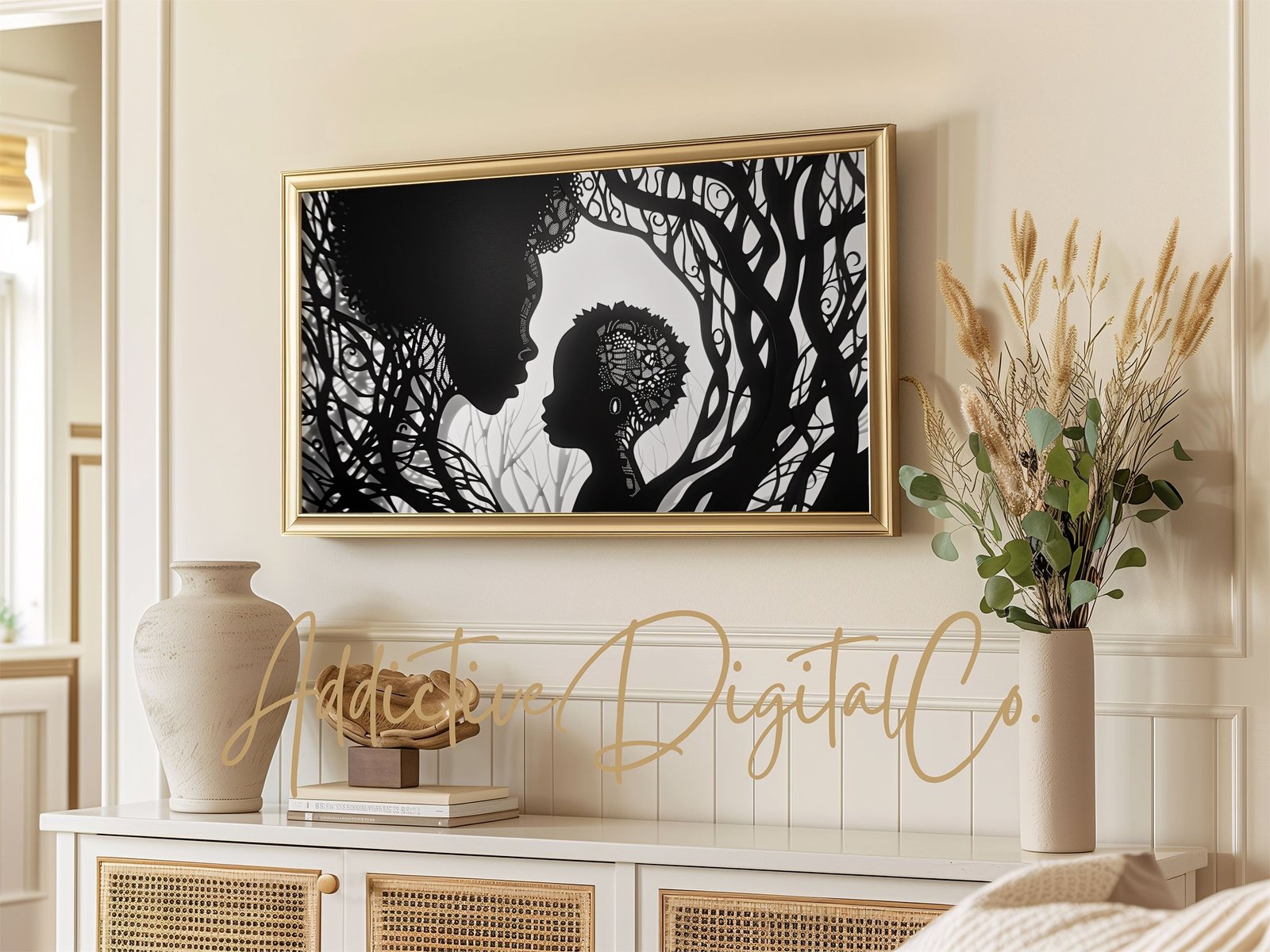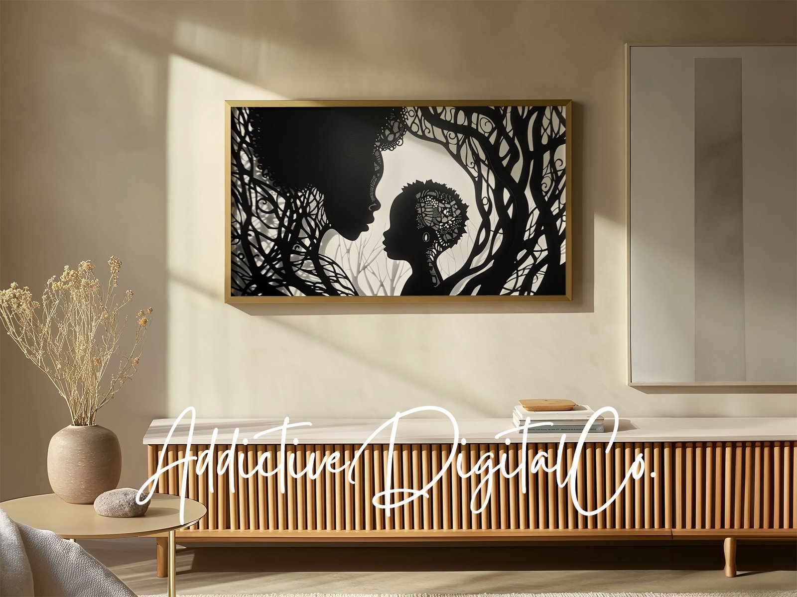 🌟 Bring elegance and culture to your digital space with this stunning African-American silhouette digital art designed for Frame TV displays. This instant digital download comes in a JPG format, tailored to enhance the ambiance of your home or office. Perfect for celebrating Mother’s Day or honoring heritage, this black and white artwork illustrates the beauty of African profiles set against an intricate tree backdrop. It’s a modern way to showcase art on your Samsung Frame TV and a unique gift for art lovers. ✨
