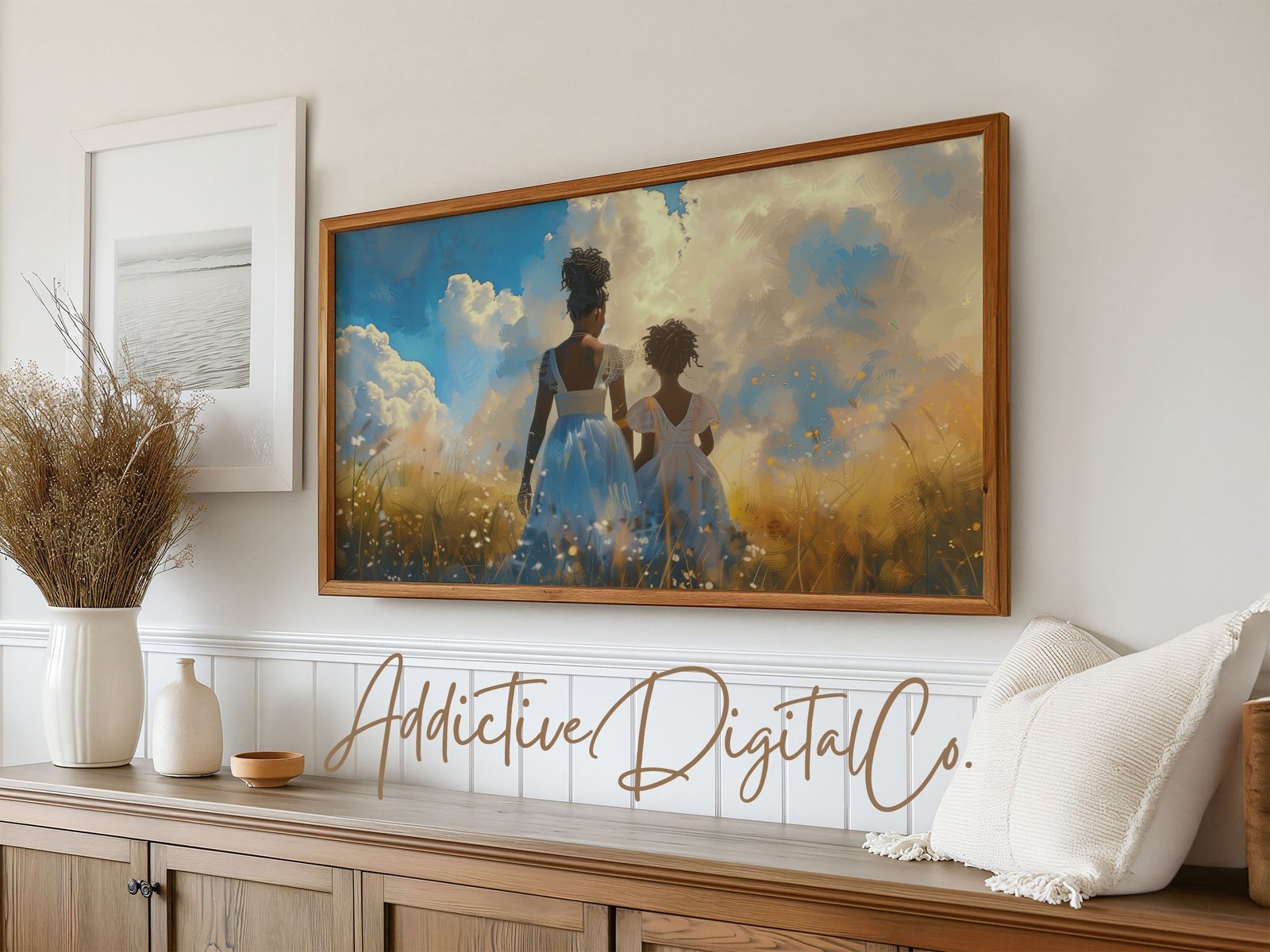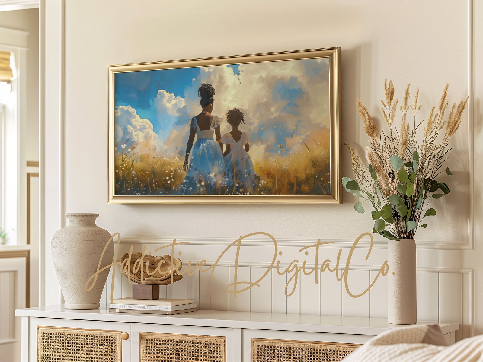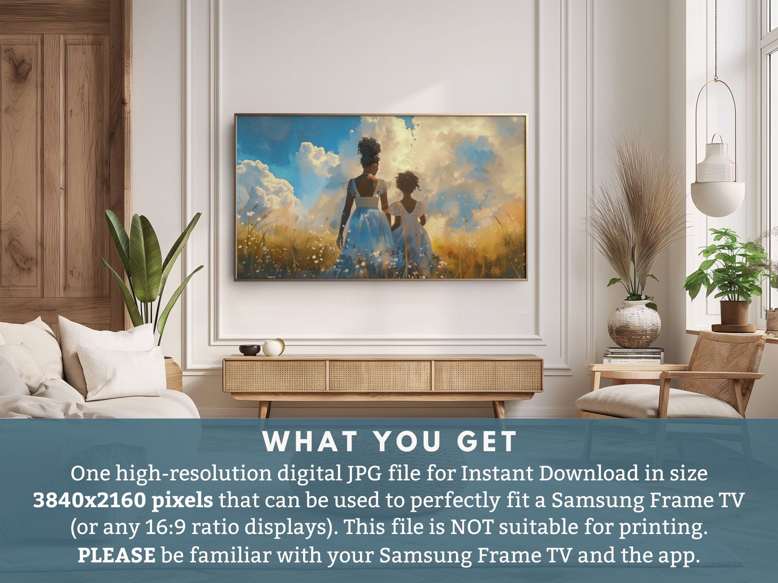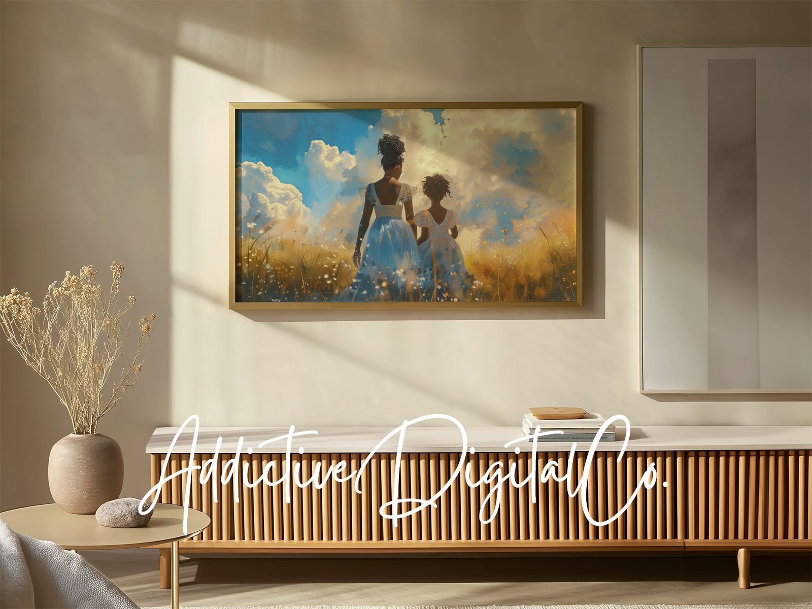 🌅✨ Bring warmth and love into your living room with this beautiful African-American Mother Daughter Frame TV Art. Perfect for celebrating the timeless bond on Mother’s Day or any special occasion, this stunning digital art piece portrays a mother and child against a backdrop of a golden, cloudy sunset. When displayed on your Samsung Frame TV, it transforms your space into a serene and loving atmosphere. Instantly download this JPG and enjoy an effortless update to your TV room decor!